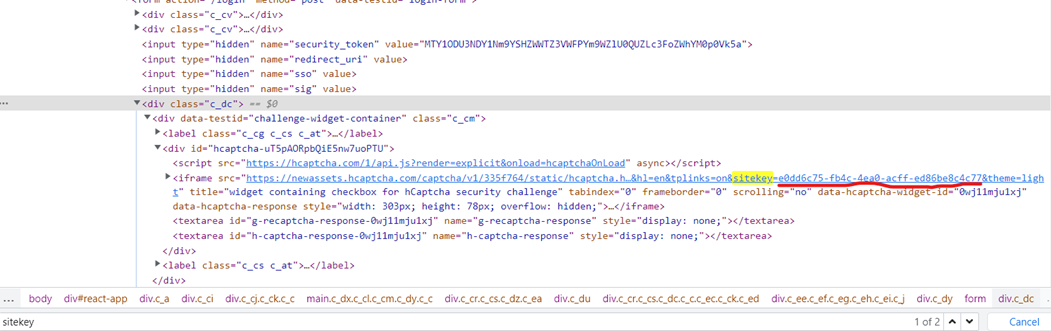 Đầu tiên, bạn cần tìm giá trị của tham số data-sitekey trong mã nguồn của trang web chứa hCAPTCHA. Mở bảng điều khiển dành cho nhà phát triển trong trình duyệt của bạn và tìm phần tử có thuộc tính data-sitekey