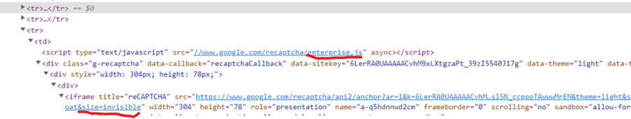 size=invisibleĐối tượng cấu hình của reCAPTCHA chứa tham số size mà được set là invisible, ví dụ