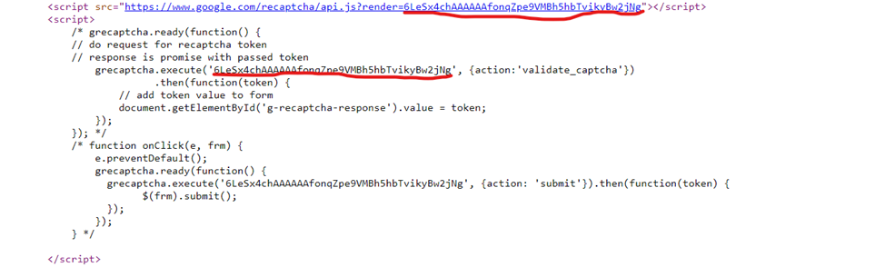 Trước tiên, bạn phải chắc chắn rằng trang web mục tiêu đang thực sự sử dụng reCAPTCHA V3. Dấu hiệu V3 nếu: - tập lệnh api.js đang tải với tham số render=sitekey, ví dụ: https://www.google.com/recaptcha/api.js?render=6LfZil0UAAAAAAdm1Dpzsw9q0F11-bmervx9g5fE - mảng client của đối tượng ___grecaptcha_cfg đang sử dụng chỉ số 100000: ___grecaptcha_cfg.clients[100000] sitekey - tham số này có thể được lấy từ URI của api.js dưới dạng giá trị của tham số render. Nó cũng có thể được tìm thấy bên trong URI của iframe reCAPTCHA, trong javascript của website nơi nó đang gọi hàm grecaptcha.execute hoặc trong đối tượng cấu hình ___grecaptcha_cfg